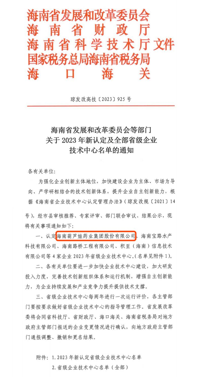 近日,海南省发改委等多部门联合公布了《关于2023年新认定及全部省级企业技术中心名单的通知》,其中,海南尊龙时凯药业集团股份有限公司成功通过评审,被认定为省级企业技术中心,是本次获批的4家企业之一。